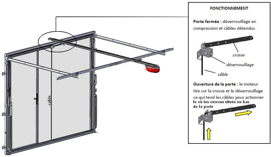 Fonctionnement : Lorsque le moteur tire la crosse, le mécanisme du basculeur tend le câble qui déverrouille alors le ou les verrous fixé(s) au bas de votre porte de garage basculante.