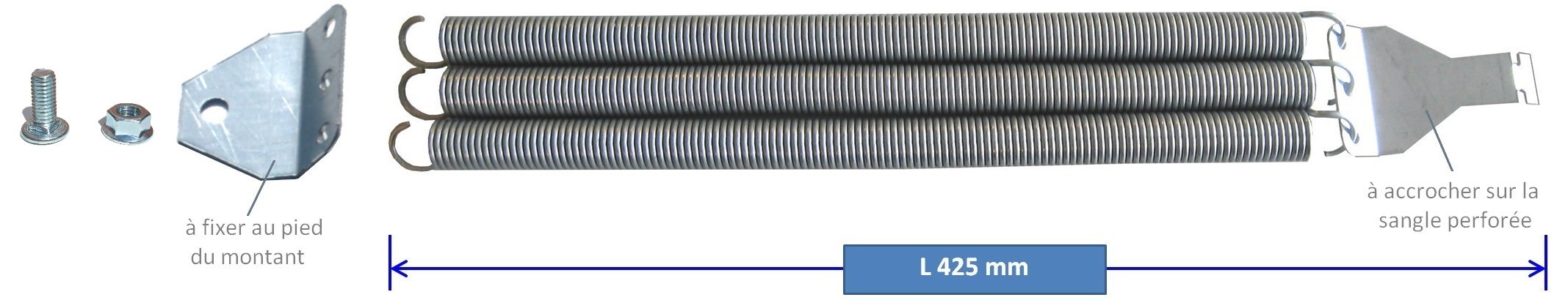 1 triangle acc. ressorts bas avec un trou : pour accroche inférieure (utile si au pied de votre montant vous n'avez pas d'accroche. Percer et boulonner au pied du montant si besoin)