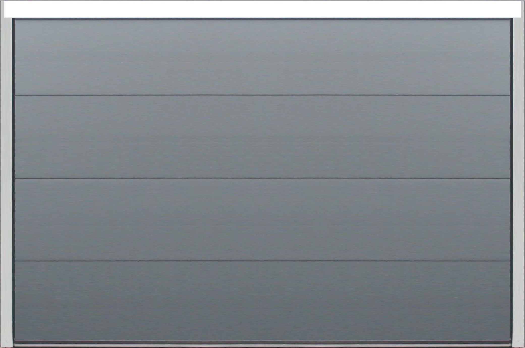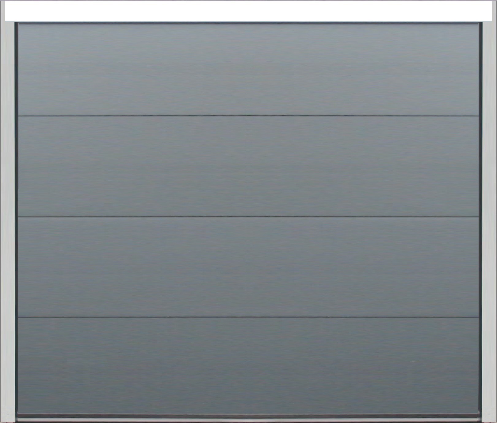 Porte de garage sectionnelle motorisée et isolante avec finition complètement lisse, sans motif, blanche.