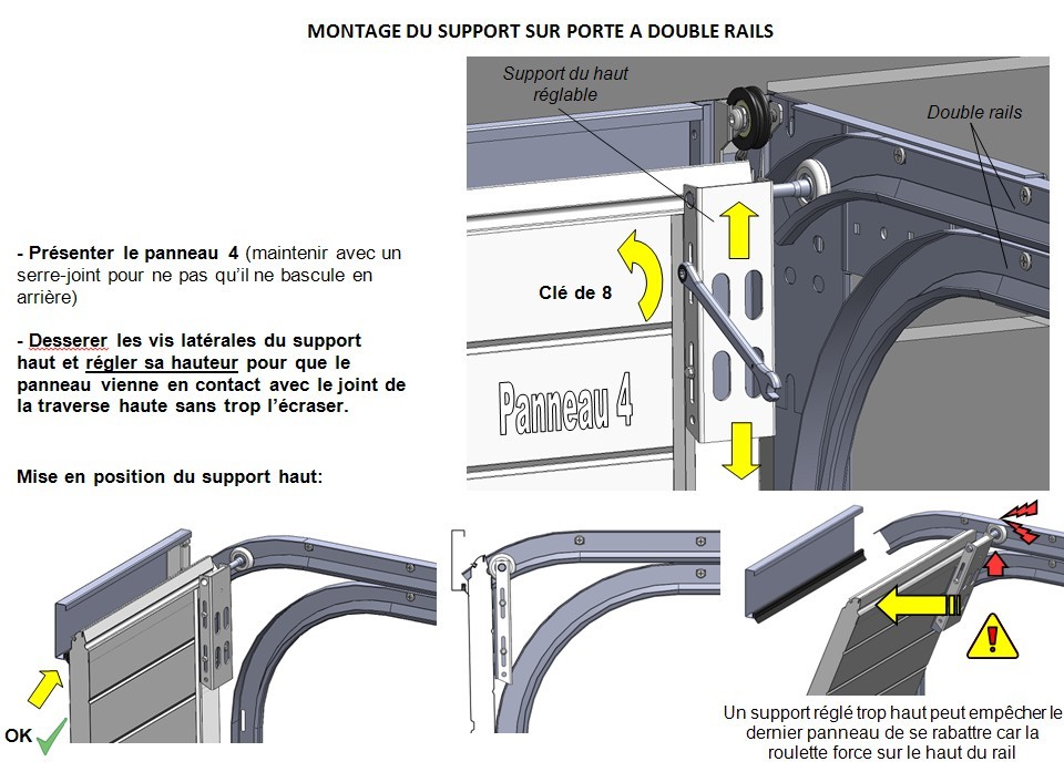 5) Ajuster la hauteur définitive en vérifiant le plaquage du panneau et bloquer les vis latérales avec une clé de 8.
