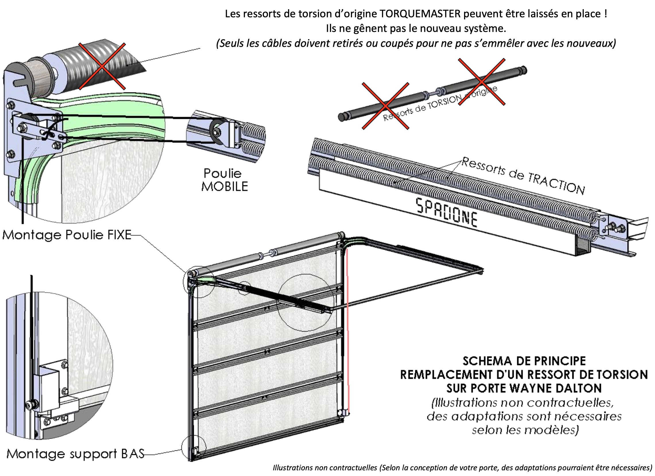 Ce kit permet de remplacer les ressorts de TORSION Torquemaster d'une sectionnelle WAYNE DALTON par des ressorts de TRACTION multiples horizontaux