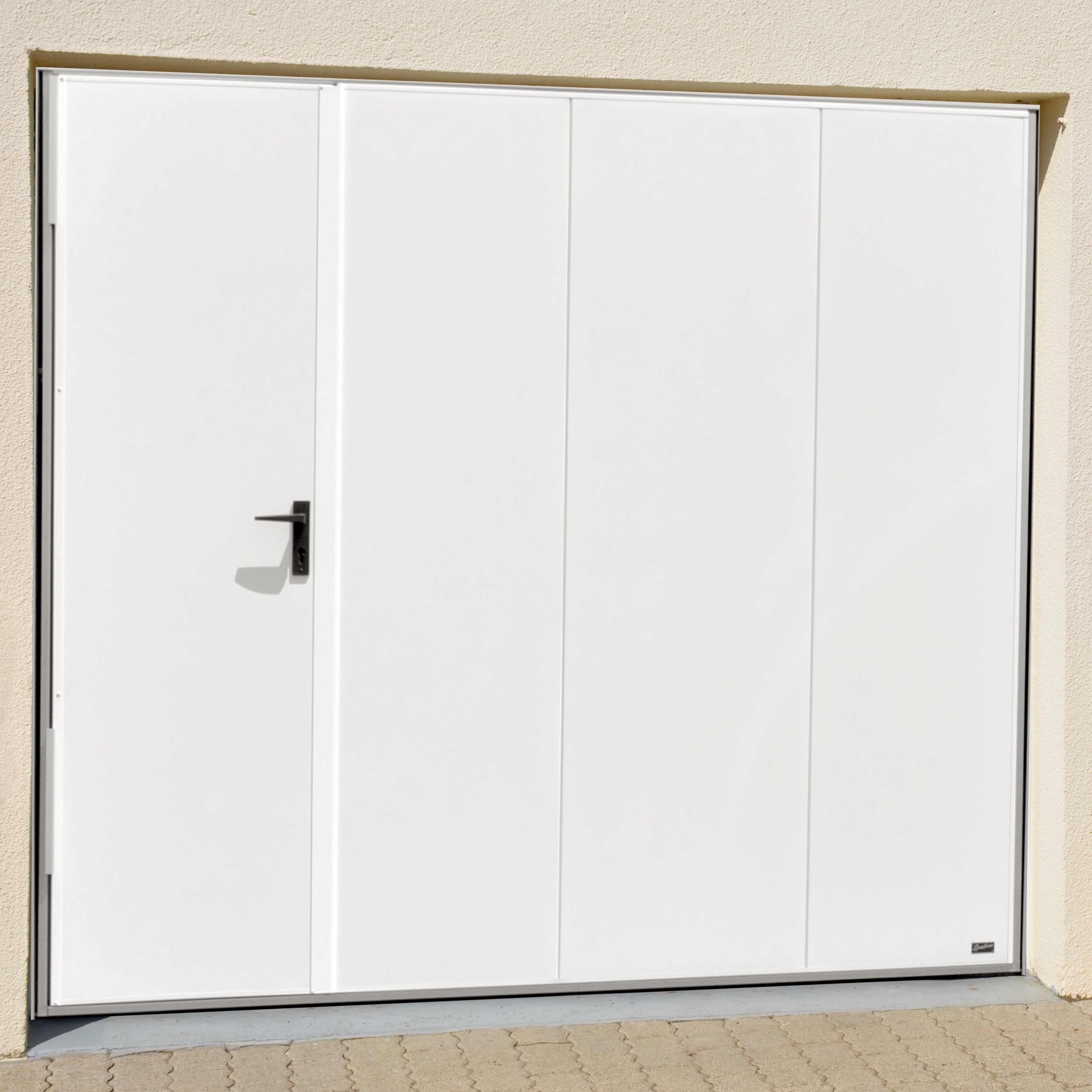 La porte basculante Lara est une porte isolée 40mm, motorisée et avec un portillon.