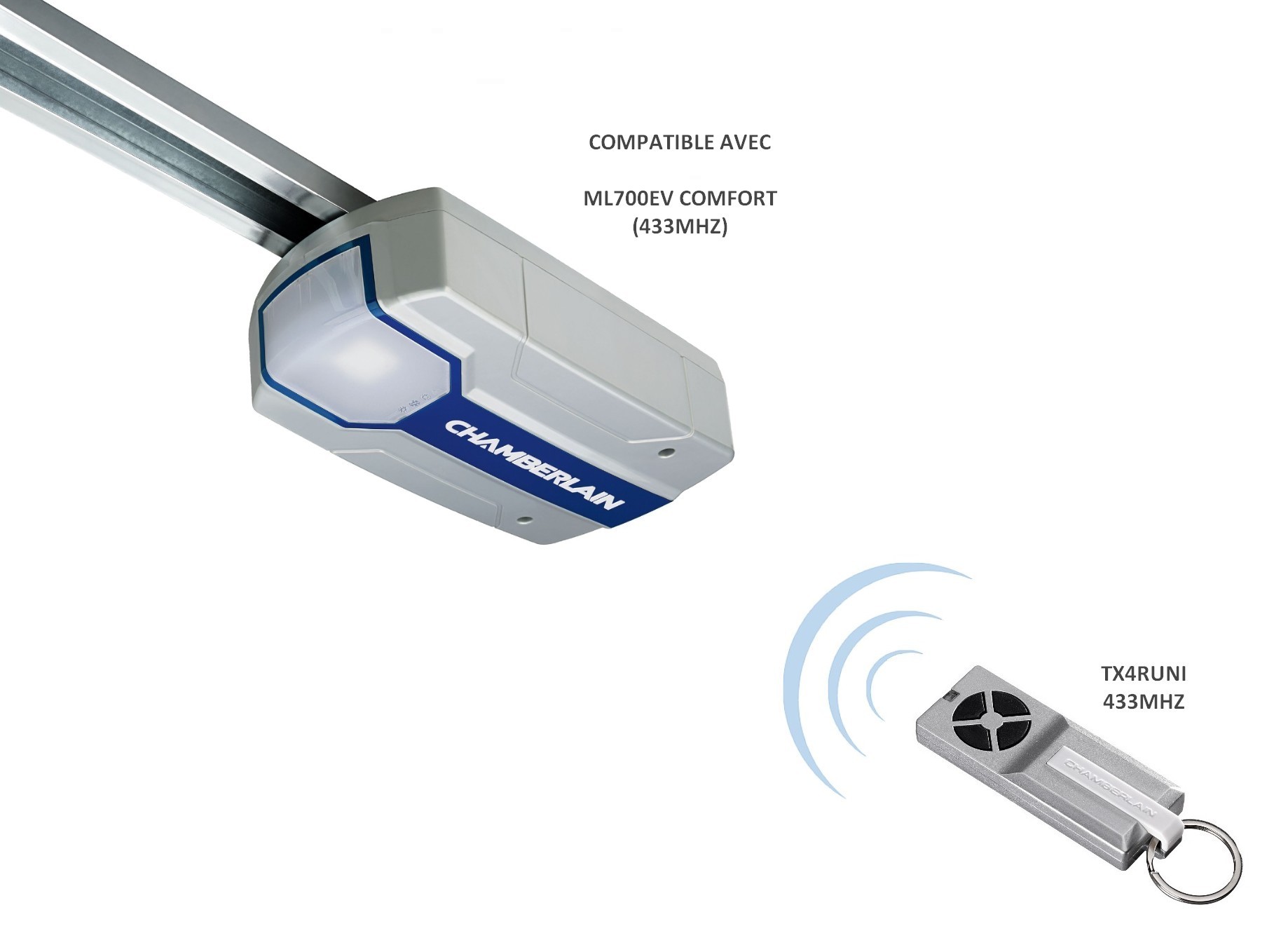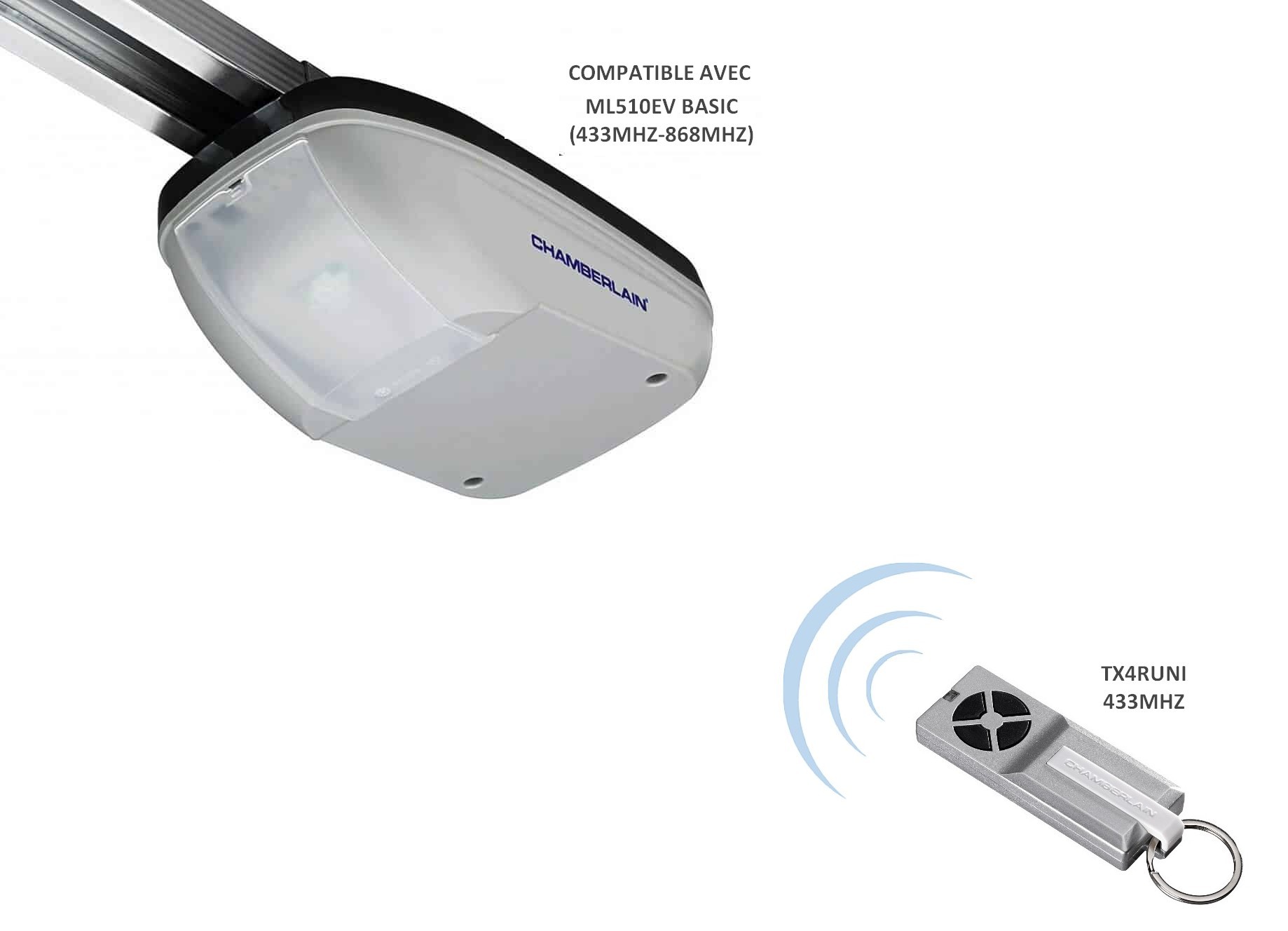 Cette télécommande TX4RUNI est compatible également tous les anciens modèles Chamberlain plus ancien, à base de 433mhz à l'exception des modèles ML510 et HE500AN