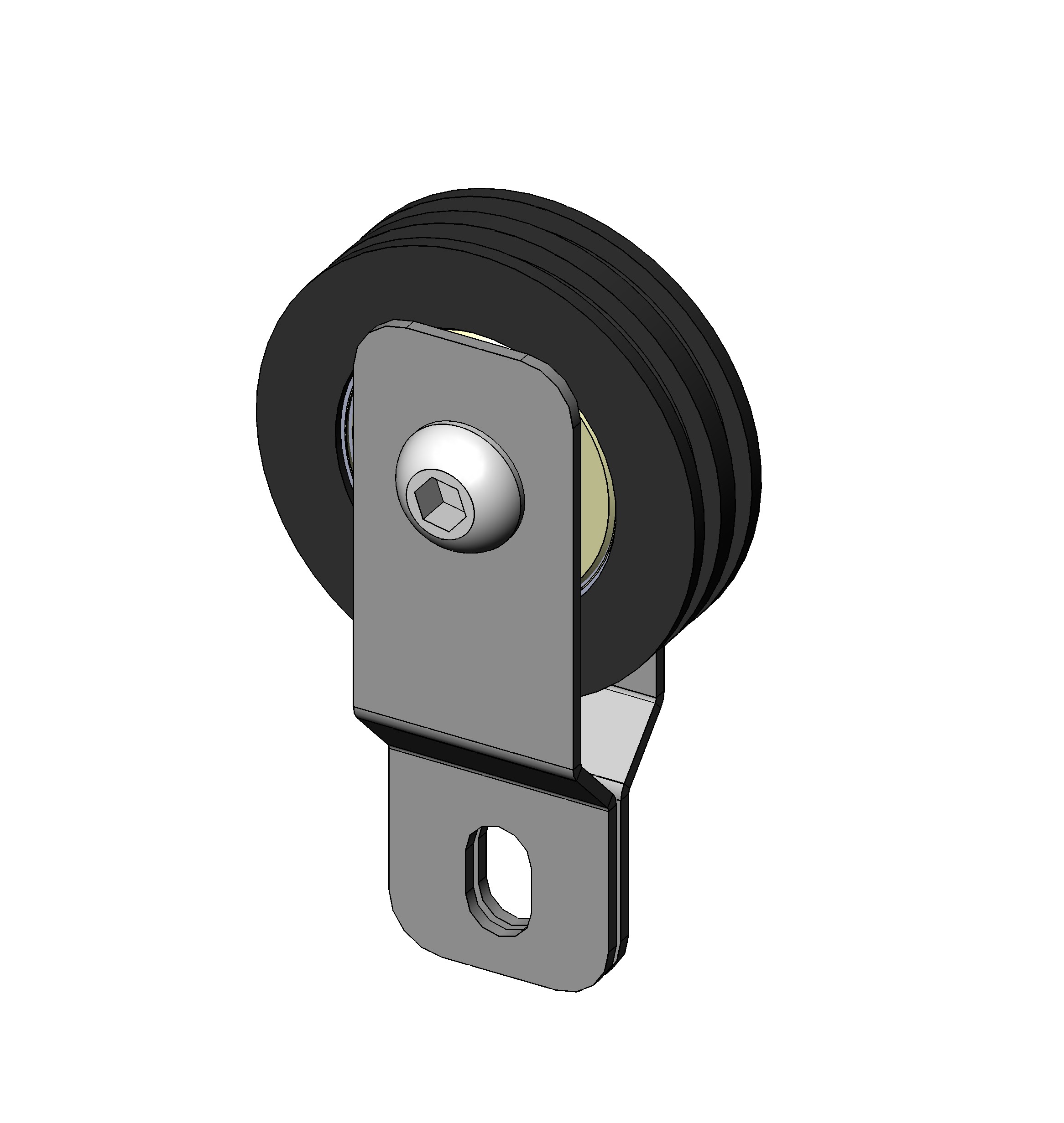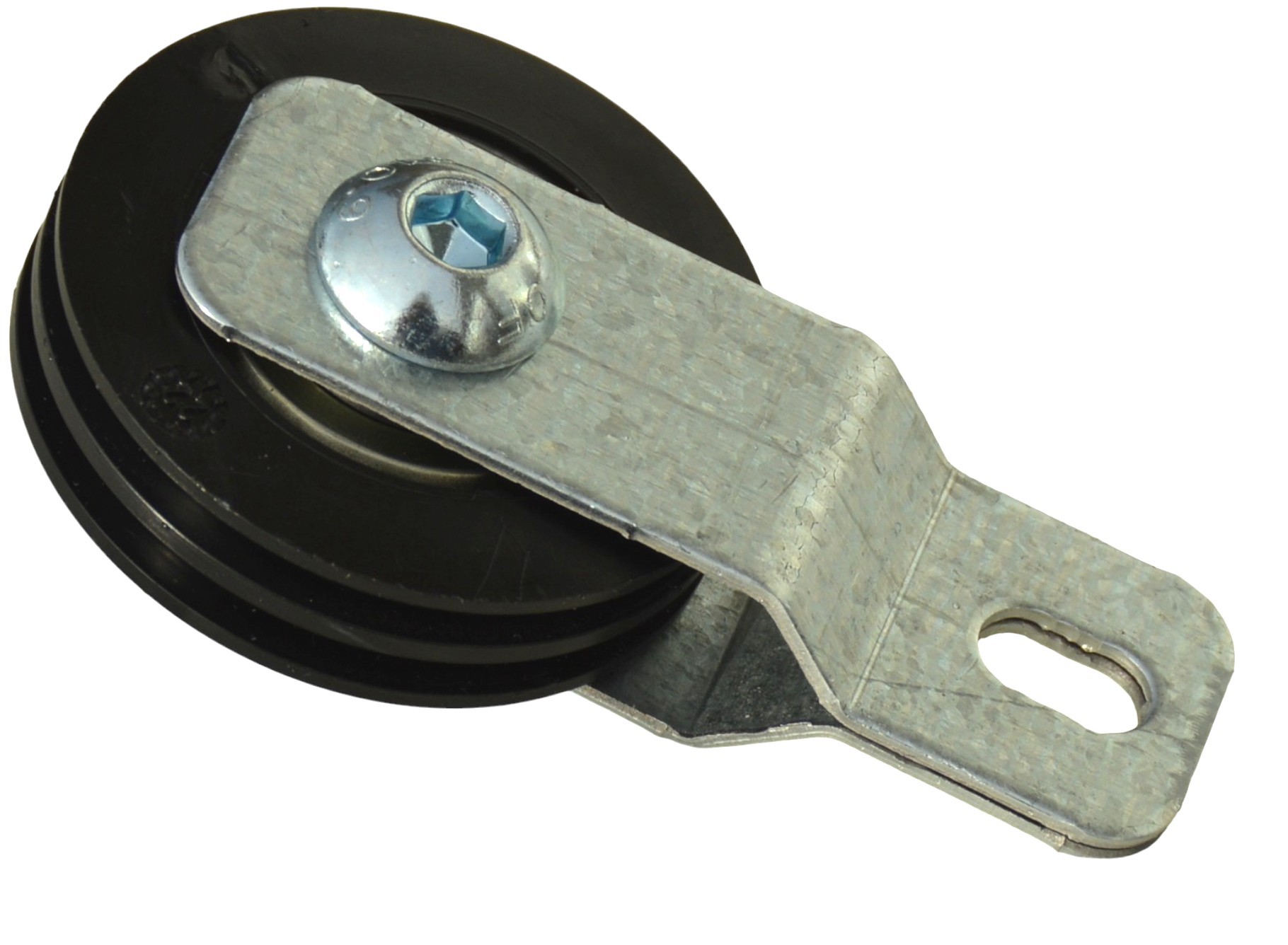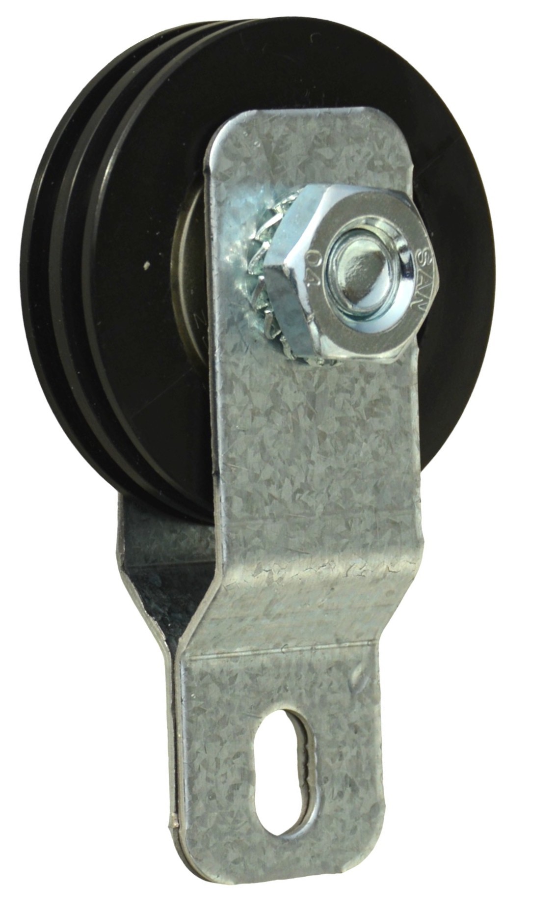 Poulie Mobile Nylon Ø 50mm Double Gorge livrée montée avec son support en acier pour utilsation sur une porte à un seul ressort à boucles par côté (ou ressort double)
