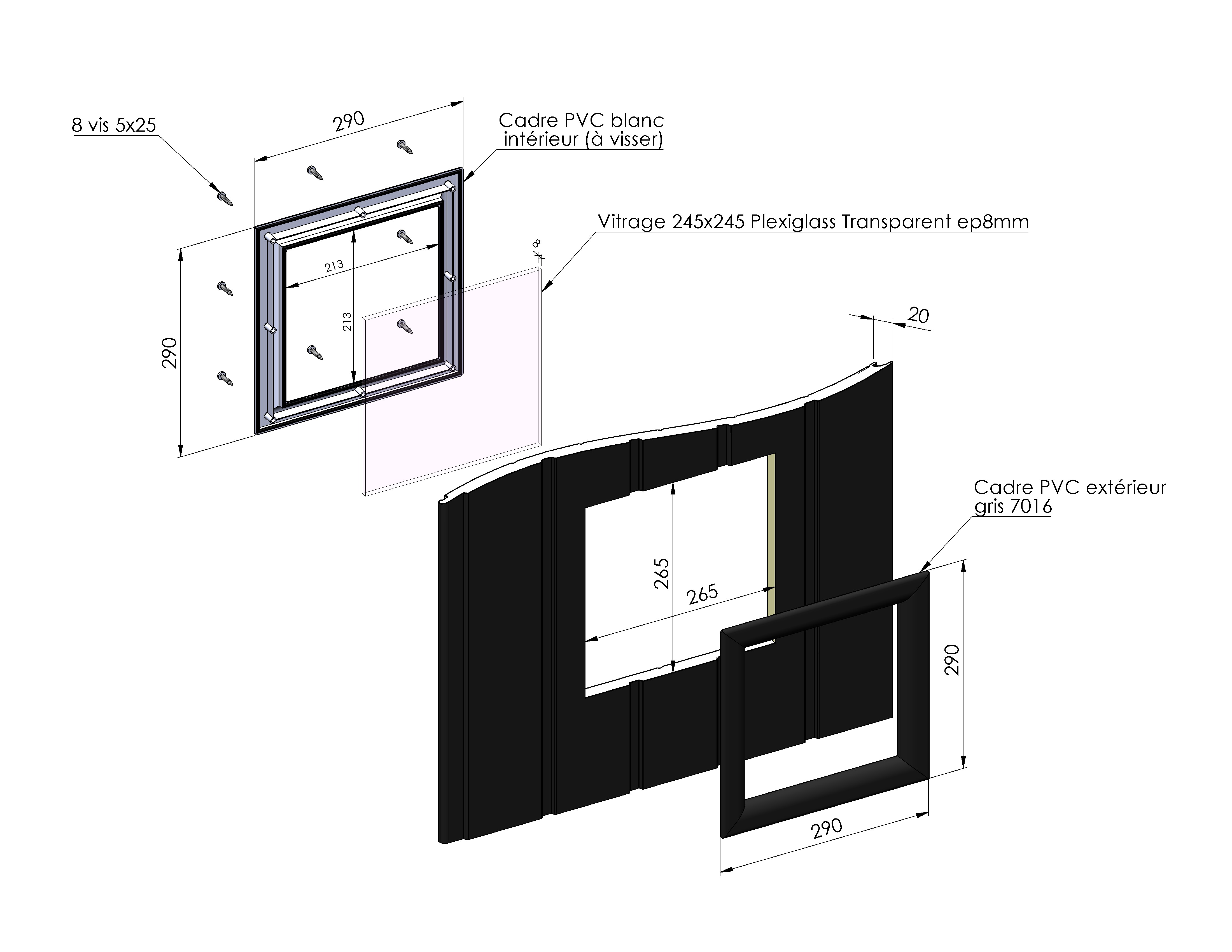 Après avoir créé la découpe dans le panneau, les 2 cadres s'emboitent et se vissent entre eux avec le vitrage
