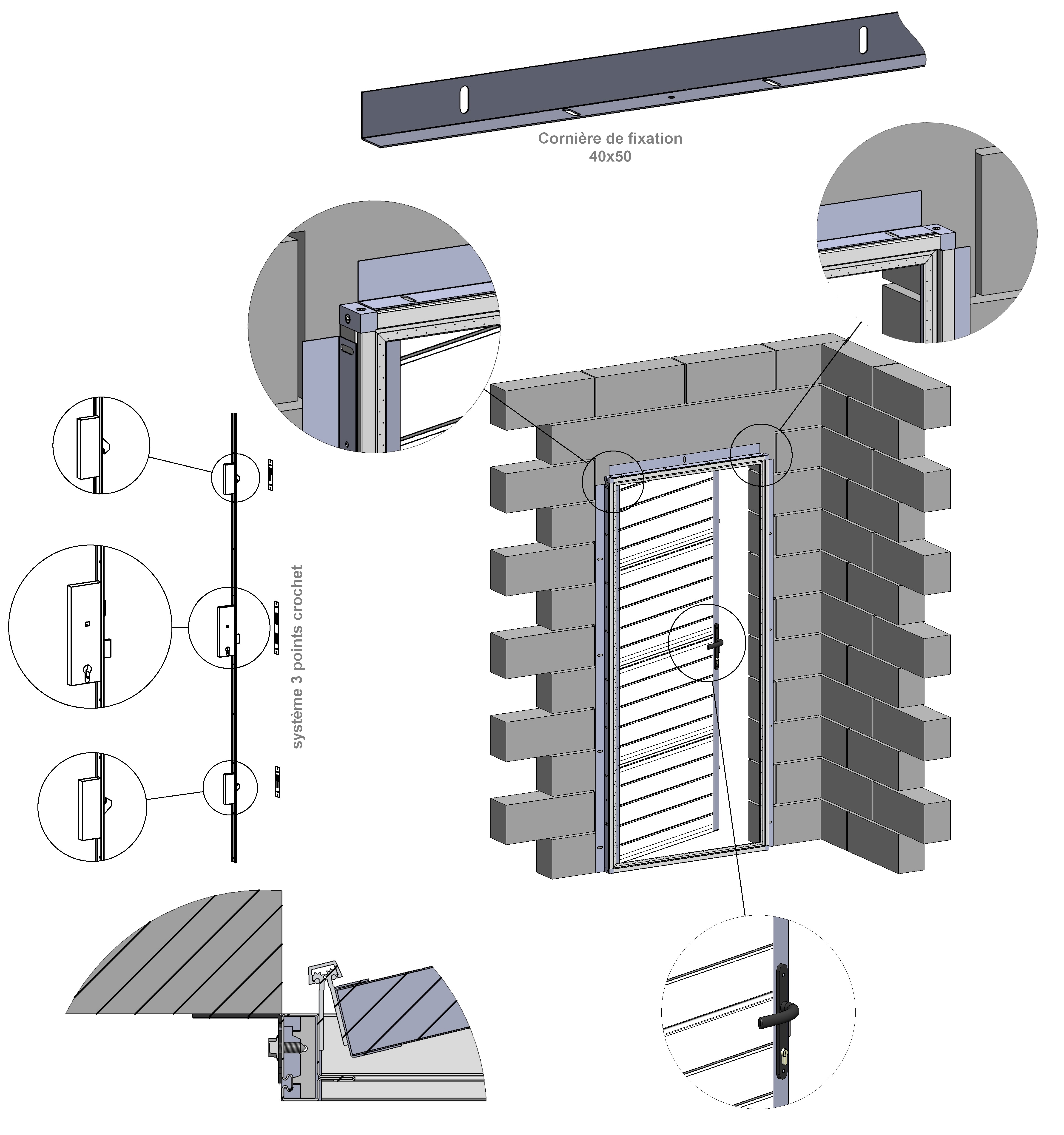 Huisserie acier 40x40, charnière alu continue, serrure 3 points à crochets.